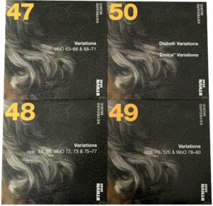 Les 32 sonates pour piano de Beethoven représentent une conception nouvelle de l’écriture pianistique : elles constituent la pierre angulaire de l’histoire de la musique pour piano et leur importance ne saurait être surestimée. Mais le compositeur composa de très nombreuses autres pièces pour le piano, dont de nombreuses séries de variations, tout au long de sa vie. L’intégralité de ces variations constitue la playlist de ces deux derniers jours. Pour la plus grande partie, cette playlist est tirée du coffret-anniversaire intégral édité en 2020 pour les 250 ans de sa naissance, que j’avais présenté ici. Je l’ai simplement complétée, pour les 32 variations WoO 80, par la fabuleuse version live d’Emil Gilels, enregistrée en 1968 à Moscou.-Cliquer sur l’image pour la voir en plus grand-.