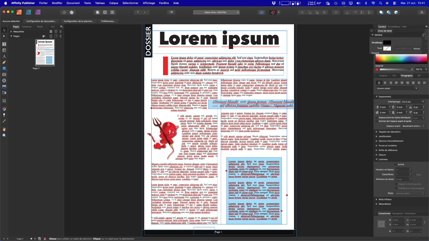 En revanche, j’avais encore en réserve le logiciel Affinity Publisher dans une version récente, maintenue à jour et compatible, elle, avec macOS 26, mais que je n’utilisais pas après l’avoir rapidement testé il y a quelques années, étant beaucoup plus rapidement productif avec XPress ! Je m’y suis donc remis très rapidement hier matin pendant une petite dizaine de minutes pour me familiariser avec le logiciel : l’occasion de prendre de nouvelles habitudes et de se plier à de nouveaux repères ou un lexique différent de celui que je maîtrise ! Au demeurant, l’outil semble très puissant lui aussi, même si certaines fonctionnalités sont déroutantes après plus de 30 ans passés avec Quark XPress ! –Cliquer sur l’image pour la voir en plus grand-.