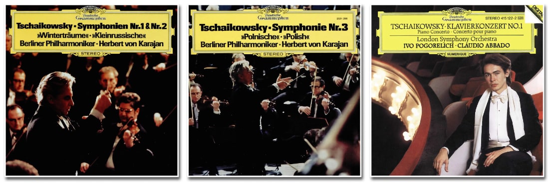 Des six symphonies de Tchaïkovsky –orthographié « à l’allemande » sur les pochettes des disques de la playlist du jour-, seules les trois dernières sont très populaires et assez massivement enregistrées. Les trois premières, a contrario, n’apparaissent souvent que dans le cadre d’intégrales et beaucoup plus rarement en albums séparés : c’est le également cas pour les deux albums consacrés à ces symphonies, enregistrées lors de la parution de l’intégrale d’Herbert Von Karajan –cliquer sur l’imagette pour la voir en plus grand– sortie en 1979 et sporadiquement apparus de manière isolée.