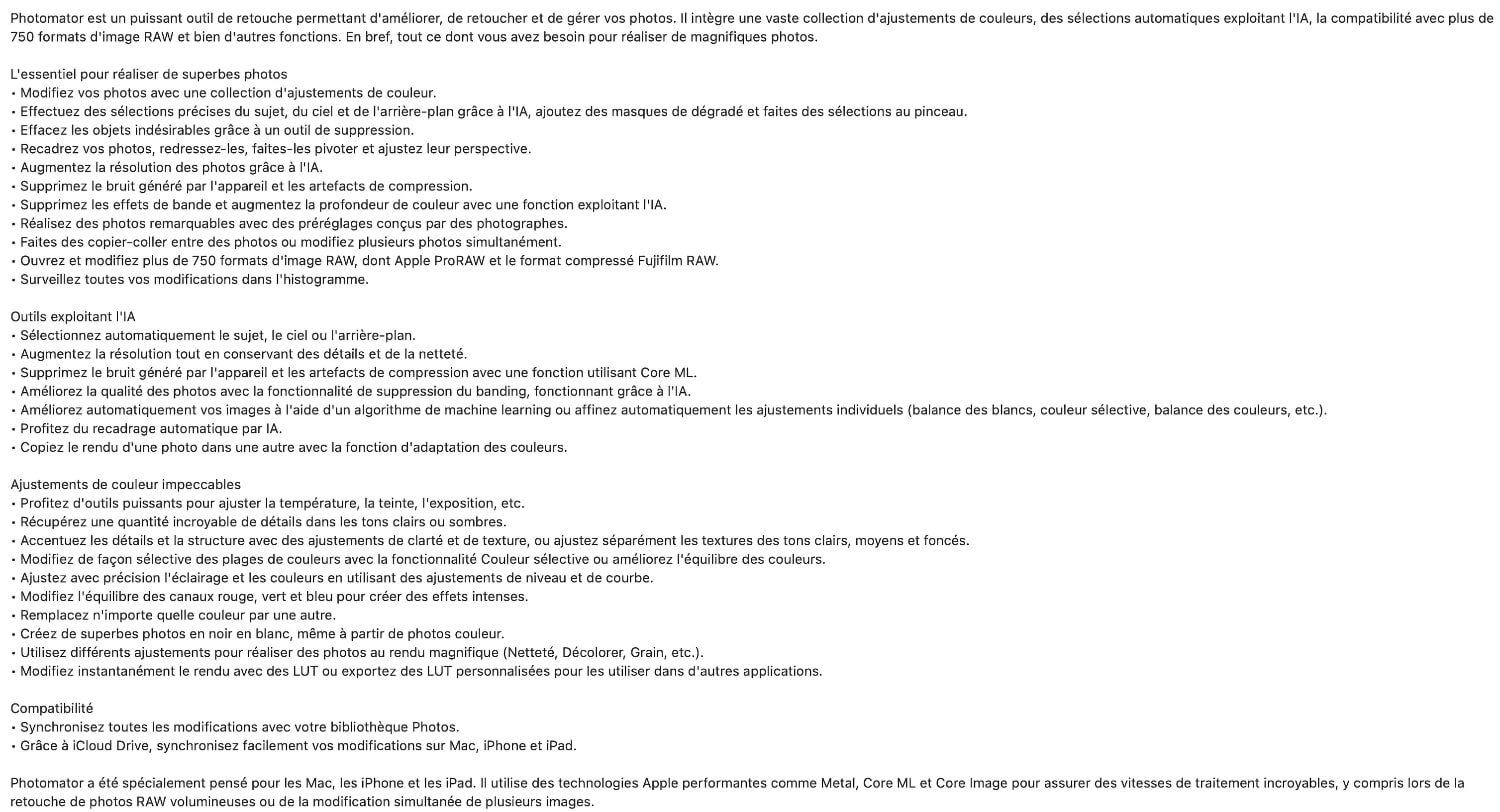 La version essayée est la dernière livrée sur la boutique Apple. L’interface est plutôt jolie et personnalisable dans une certaine mesure, et Photomator est dopé à l’intelligence artificielle pour certaines fonctions, selon l’éditeur –c’est également le cas d’un grand nombre de ses concurrents-, comme vous pourrez le lire sur l’imagette de droite –cliquer pour la voir en plus grand : soudainement, le texte sera lisible !-.