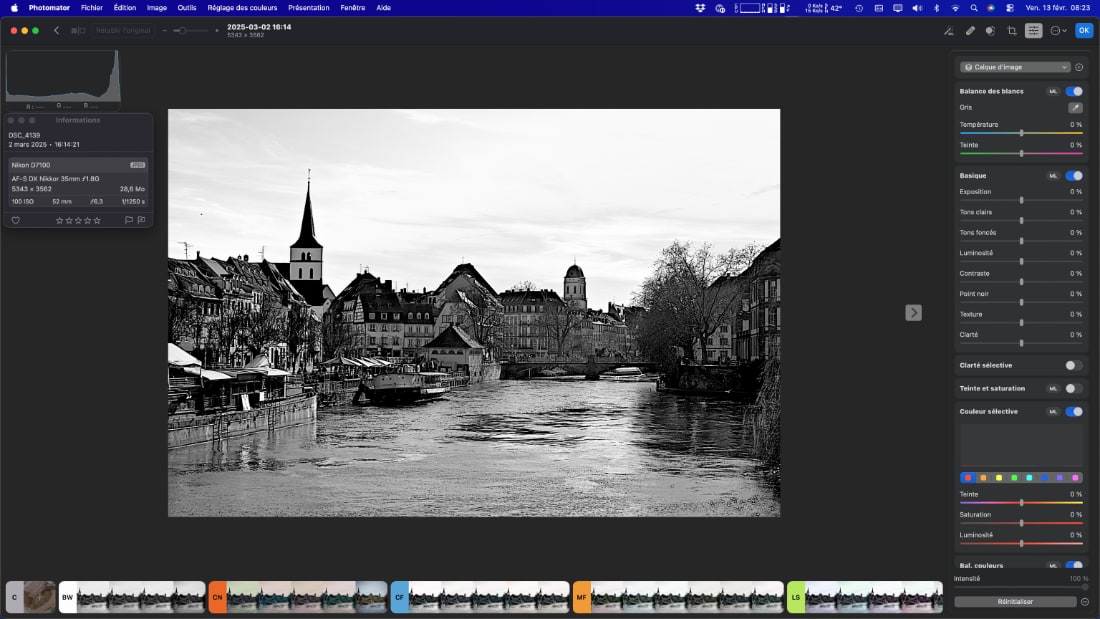 Pour le dématriçage et la retouche photo, Apple met en avant son logiciel-maison, Photomator, qui est en réalité le fruit d’un rachat de la société Pixelmator par la firme à la pomme courant 2024. C’est ce logiciel que j’essaie depuis quelques jours. –Cliquer sur l’image pour la voir en plus grand-.
