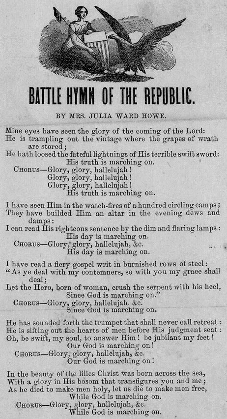 Au cours de leur visite du camp, un groupe de soldats se mit à chanter certaines des chansons de guerre populaires, parmi lesquelles « John Brown’s Body » –écrite en mémoire de l’abolitionniste John Brown, condamné à mort en Virginie pour trahison en 1859-. Le révérend Clarke suggéra à Mme Howe d’écrire de nouvelles paroles sur cette mélodie familière et très populaire.